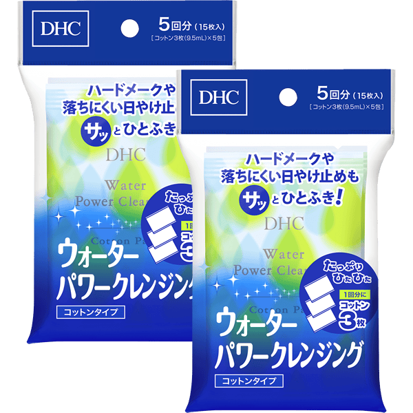 『DHCウォータークレンジング(コットンタイプ)』は、ハードなメークやパワフルな日やけ止めもふき取って落とせる、コットンタイプの水性クレンジング。天然ヤシ由来の水溶性洗浄成分のクレンジングウォーターをしみこませたコットンを軽く肌にすべらせるだけで、ウォータープルーフタイプのメークも簡単オフ。さっぱりとした使用感で余分な皮脂や肌表面の汚れもスッキリ落とせ、ダブル洗顔は不要です。