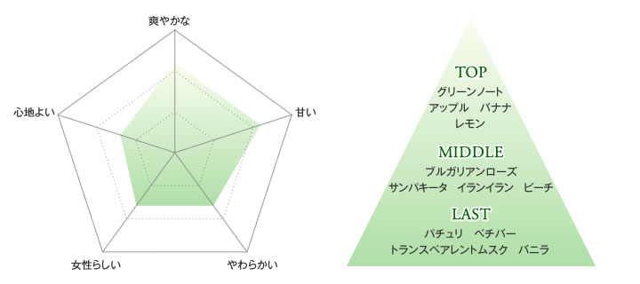 さわやかなグリーンノートとブルガリアンローズが調和された、モダンで上品なシプレフローラルの香り