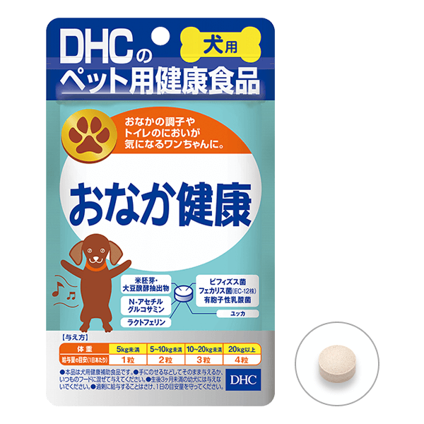 『犬用 国産 おなか健康』は、腸全体にはたらきかけるビフィズス菌、フェカリス菌、有胞子性乳酸菌の3つの善玉菌と、その善玉菌のはたらきを高める成分の米胚芽・大豆醗酵抽出物やラクトフェリン、ニオイにはたらくユッカ抽出物を配合。ワンちゃんがよろこぶチキンスープ&ポークエキスとビール酵母が入った、食べやすい大きさと固さのタブレットです。