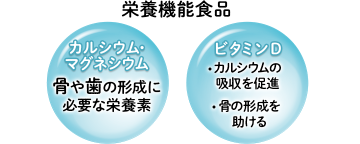 - ●カルシウム及びマグネシウムは、骨や歯の形成に必要な栄養素です。