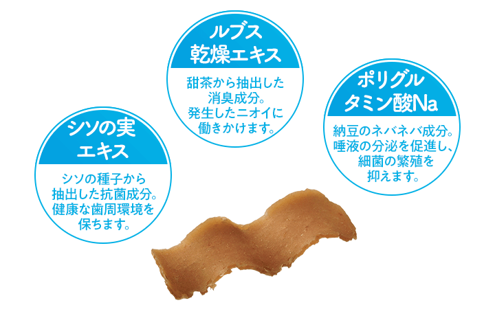 フード臭や、胃や腸からの戻り臭といった口臭の原因からお口のエチケットに役立つ成分を厳選しました。