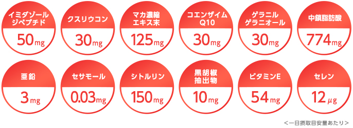 【栄養成分表示[6粒2940mgあたり]】熱量16.6kcal、たんぱく質1.21g、脂質1.12g、炭水化物0.41g、食塩相当量0.01g、ビタミンE 54.0mg、亜鉛3.0mg、セレン12μg、セサミン(醗酵黒ゴマエキス末由来)36mg、セサモール(醗酵黒ゴマエキス末由来)0.03mg、中鎖脂肪酸油774mg、鶏肉抽出物234mg(イミダゾールジペプチド50mg)、シトルリン150mg、マカ濃縮エキス末125mg(ベンジルグルコシノレート3mg)、ゲラニルゲラニオール30mg、コエンザイムQ10 30mg、クスリウコン30mg、黒胡椒抽出物10mg