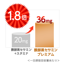 『醗酵黒セサミン プレミアム』は、セサミン研究の実績から実感型を目指し、当社従来品※1の1.8倍である36mg※2ものセサミンを配合しました。