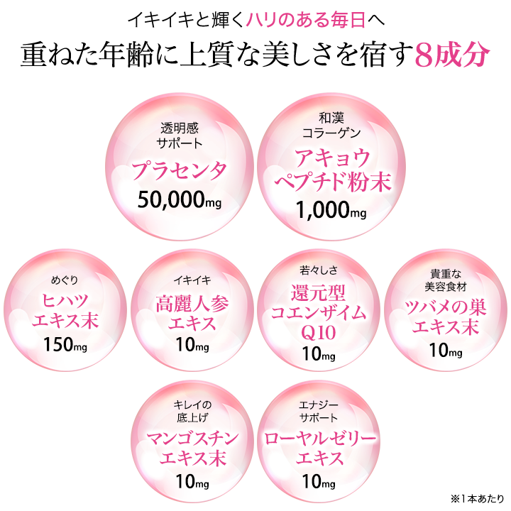 高配合※のプラセンタに加え、古くから美容によいとされる美容成分やエナジーサポート成分も配合しました。楊貴妃や西太后も愛用したとされるロバ皮由来のコラーゲン「アキョウ」、貴重な美容・健康食材として知られる「ツバメの巣」「高麗人参」、若々しさをサポートするとされる「還元型コエンザイムQ10」、キレイをサポートするとされる「マンゴスチンエキス」、スムーズな毎日をサポートする「ヒハツエキス」、女王バチのエネルギー源「ローヤルゼリー」とあわせた8つの美容成分が、イキイキとした上質な美しさを支えます。