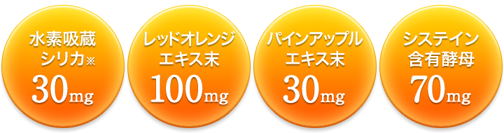 DHCはシチリア産レッドオレンジのパワーに着目し、水素をアシストする成分として3種のレッドオレンジエキス末をバランス良く配合。さらに、美容のサポートにパインアップルエキス末と、システイン含有酵母もプラスしました。