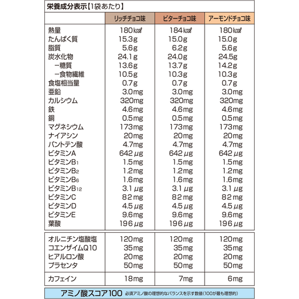 ◆アーモンドチョコ味:難消化性デキストリン(アメリカ製造)、大豆蛋白、乾燥全卵、砂糖、乳蛋白濃縮物、ココアパウダー、でん粉、粉末油脂(食用植物油脂、コーンシラップ)、ドロマイト、粉末醤油、アーモンドパウダー、オルニチン塩酸塩、コエンザイムQ10、プラセンタエキス末、パン酵母/ベーキングパウダー、香料、甘味料(アスパルテーム・L-フェニルアラニン化合物)、V.C、カゼインNa、増粘剤(キサンタンガム)、クエン酸鉄Na、乳化剤、ヒアルロン酸、ナイアシン、V.E、加工デンプン、パントテン酸Ca、カラメル色素、V.B6、V.B2、V.B1、V.A、調味料(アミノ酸)、葉酸、酸化防止剤(トコフェロール)、V.D、V.B12、(一部に小麦・卵・乳成分・大豆・豚肉・アーモンドを含む)