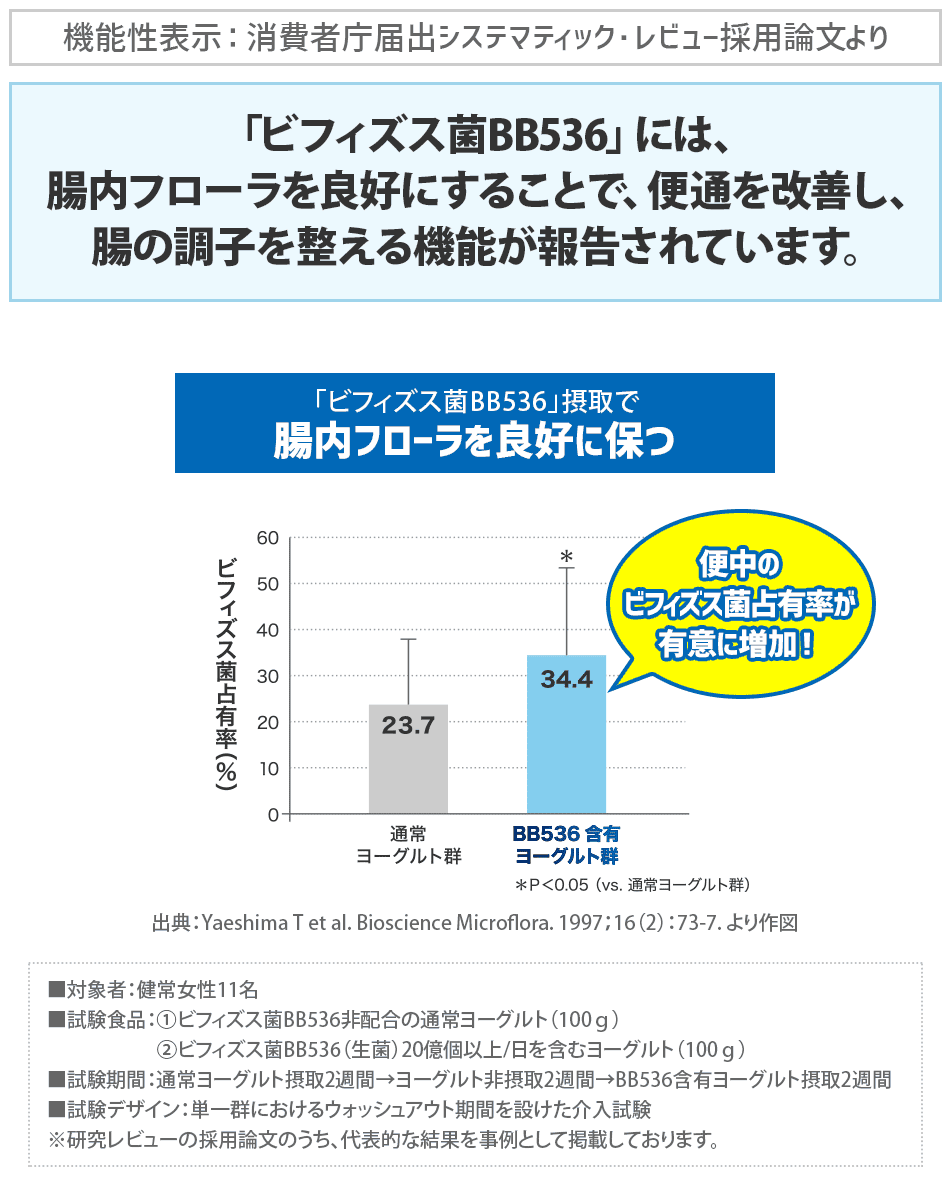 本品には、生きたビフィズス菌BB536が含まれます。ビフィズス菌BB536には、腸内フローラを良好にすることで、便通を改善し、腸の調子を整える機能が報告されています。