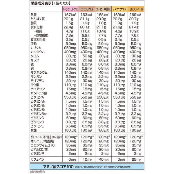 ◆いちごミルク味:大豆蛋白(国内製造)、乳蛋白、デキストリン、難消化性デキストリン、果糖、いちごパウダー(いちご(国産いちご100%))、ドロマイト、乳等を主要原料とする食品、粉末油脂、パン酵母、オルニチン塩酸塩、ブドウ種子エキス末、コエンザイムQ10/クエン酸K、香料、増粘剤(キサンタンガム)、塩化K、乳化剤、甘味料(アスパルテーム・L-フェニルアラニン化合物、スクラロース、アセスルファムK)、ベニコウジ色素、V.C、ピロリン酸鉄、ヒアルロン酸、ナイアシン、V.E、パントテン酸Ca、V.B1、ヘスペリジン、V.B2、V.B6、V.A、葉酸、V.D、V.B12
