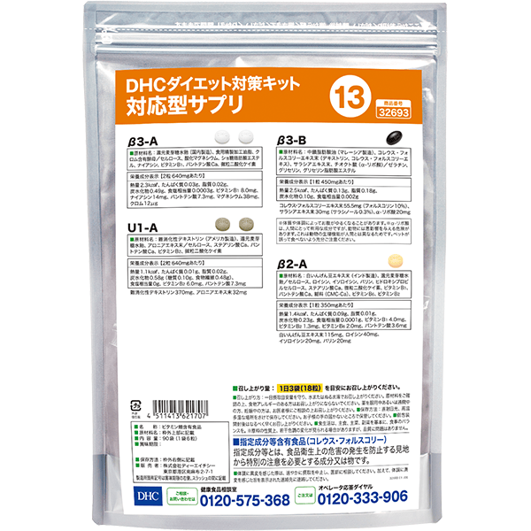 【栄養成分表示】[1粒 450mgあたり]熱量2.5kcal、たんぱく質0.13g、脂質0.18g、炭水化物0.10g、食塩相当量0.002g、コレウス・フォルスコリーエキス末55.5mg(フォルスコリン10%)、サラシアエキス末30mg(サラシノール0.3%)、α-リポ酸20mg