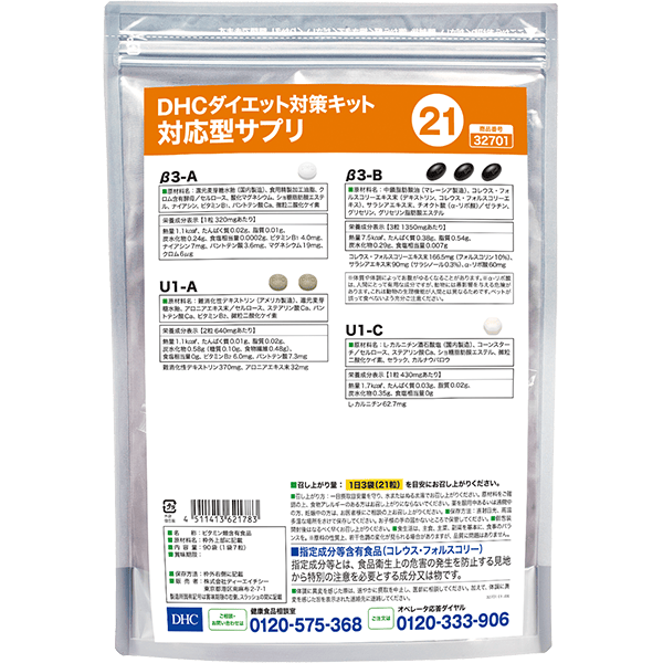 【栄養成分表示】[3粒 1350mgあたり]熱量7.5kcal、たんぱく質0.38g、脂質0.54g、炭水化物0.29g、食塩相当量0.007g、コレウス・フォルスコリーエキス末166.5mg(フォルスコリン10%)、サラシアエキス末90mg(サラシノール0.3%)、α-リポ酸60mg