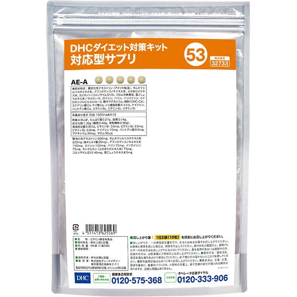 【原材料名】難消化性デキストリン(アメリカ製造)、ギムネマシルベスタエキス末、アフリカマンゴノキエキス末、えのきたけエキス末、ユビキノン(コエンザイムQ10)、クロム含有酵母、黒こしょうエキス末/セルロース、ロイシン、バリン、イソロイシン、ヒドロキシプロピルセルロース、酸化マグネシウム、糊料(CMC-Ca)、ステアリン酸Ca、ケイ酸Ca、ショ糖脂肪酸エステル、ナイアシン、パントテン酸Ca、ビタミンB6、ビタミンB2、ビタミンB1