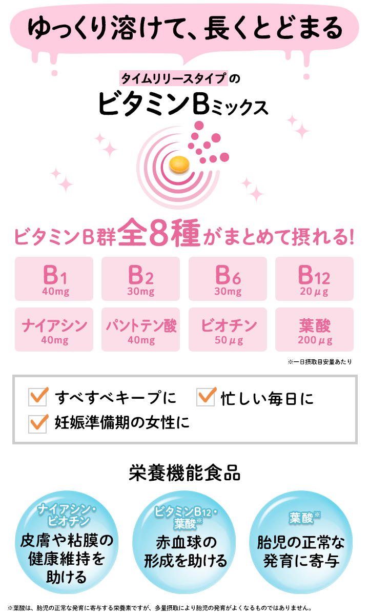 タイムリリース処方でゆっくり放出! 8種のビタミンB群を効率よく摂ろう!