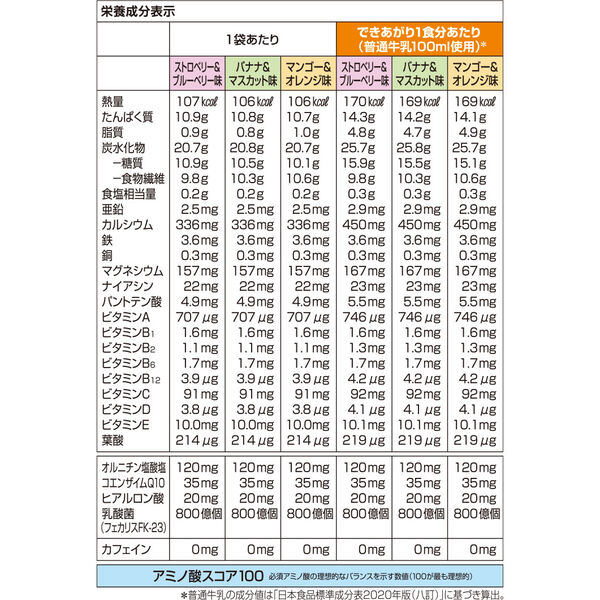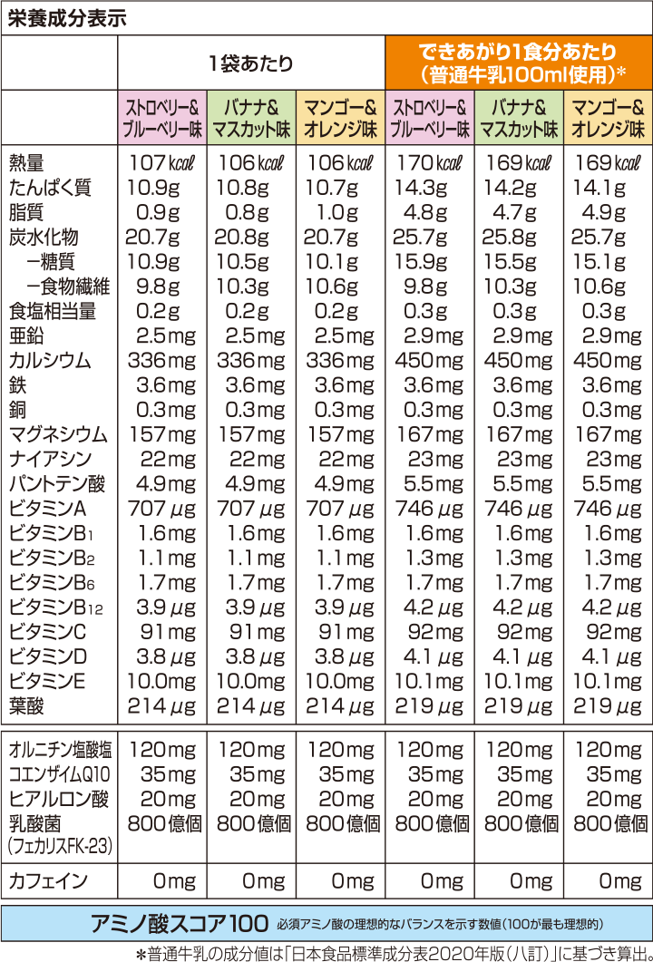 ◆マンゴー&オレンジ味:難消化性デキストリン(アメリカ製造)、乳蛋白濃縮物、大豆蛋白、マンゴーパウダー(デキストリン、マンゴーピューレ)、ブドウ糖、ドロマイト、バナナパウダー(デキストリン、バナナピューレ)、果汁パウダー(オレンジ濃縮果汁、デキストリン、温州みかん濃縮果汁)、オルニチン塩酸塩、コエンザイムQ10、パン酵母、乳酸菌末(殺菌)/加工デンプン、増粘剤(キサンタンガム)、酸味料、V.C、甘味料(アスパルテーム・L-フェニルアラニン化合物、アセスルファムK)、クエン酸鉄Na、ヒアルロン酸、ナイアシン、V.E、香料、パントテン酸Ca、カロテノイド色素、V.B6、V.B2、V.B1、V.A、葉酸、V.D、V.B12、(一部に乳成分・大豆・オレンジ・バナナを含む)
