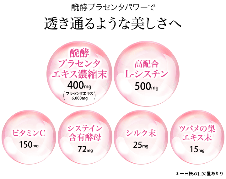 【栄養成分表示[4粒2000mgあたり]】熱量7.0kcal、たんぱく質0.65g、脂質0.04g、炭水化物1.02g、食塩相当量0.01g、ビタミンC 150mg、醗酵プラセンタエキス濃縮末400mg(プラセンタエキス6000mg)、L-シスチン500mg、システイン含有酵母72mg、シルク末25mg、ツバメの巣エキス末15mg
