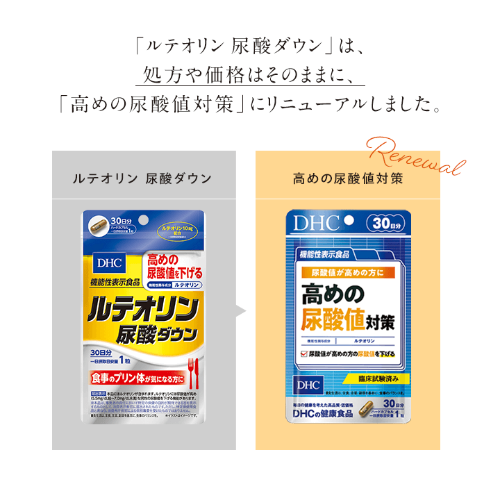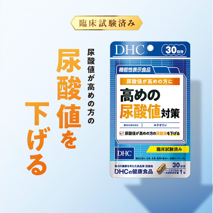 『高めの尿酸値対策』は、機能性関与成分ルテオリンを一日摂取目安量あたり10mg配合した機能性表示食品です。ルテオリンには、尿酸値が高めの方の尿酸値を下げる機能があります。尿酸値は気になりつつも、日常生活でなかなかプリン体を避けられない…。そんな方におすすめです。