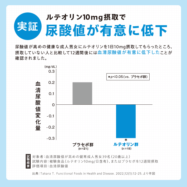 ≪臨床試験済み≫「ルテオリン」が高めの尿酸値を下げる! 尿酸値が高めの方に