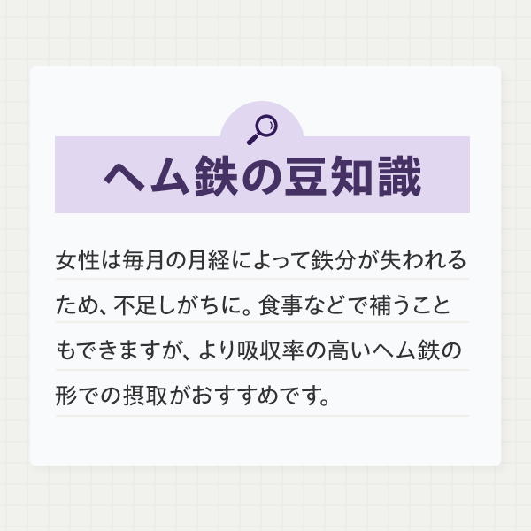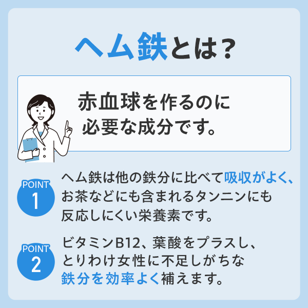 『ヘム鉄』は、ヘム鉄にビタミンB12、葉酸をプラス。とりわけ女性に不足しがちな鉄分を効率よく補えるサプリメントです。鉄不足が気になる方や、育ちざかりの方におすすめです。