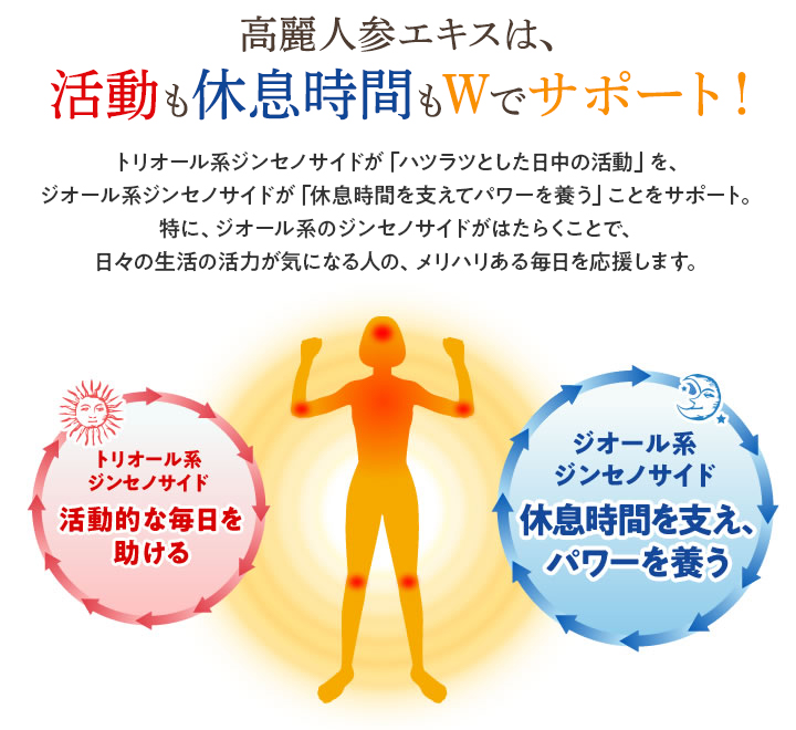 高麗人参に含まれる健康サポート成分にジンセノサイドという成分がありますが、紅参は原料メーカーの独自技術により、吸収されやすい状態にあるプレミアムジンセノサイドがより多く含まれています。また、休息時間を支え、しっかりとパワーを補うことをサポートするジオール系のジンセノサイドを多く含み、大人の女性の、活動的でハツラツとした健康生活をサポートします。