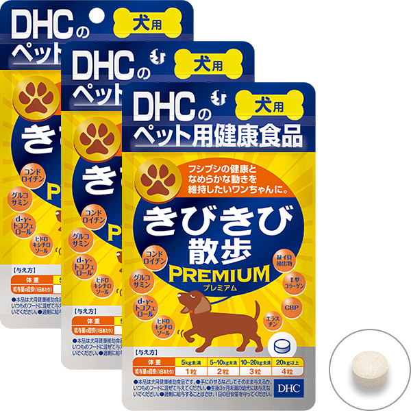 お客様からの声にお応えし、大人気のきびきび散歩に新成分をプラスした『犬用 国産 きびきび散歩 プレミアム』が登場しました。従来のきびきび散歩に配合されていた人気の4成分に加え、緑イ貝抽出物やCBPを配合。プレミアムな働きで、ワンちゃんの関節の健康を守ります。