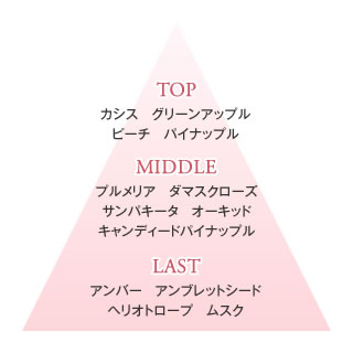 可憐に咲き誇るプルメリアのかぐわしい香りをメインに、フレッシュなカシスとグリーンアップル、ふわっと甘いピーチのフルーツカクテル、そして砂糖づけパイナップルのチャーミングなアクセント。