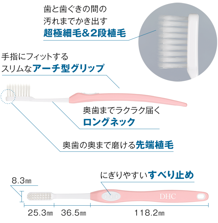 歯周病菌の潜む汚れをしっかり除去するDHCのオリジナル歯ブラシ『DHCデンタルブラシ』は、すき間の奥まで届く効率設計。お口のトラブルの原因となる歯垢を除去するために、使いやすさをきわめた歯ブラシです。