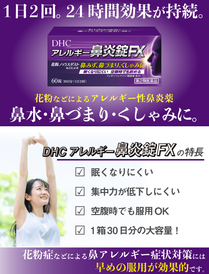 『DHCアレルギー鼻炎錠FX』は、フェキソフェナジン塩酸塩を配合した、眠くなりにくいアレルギー専用鼻炎薬です。