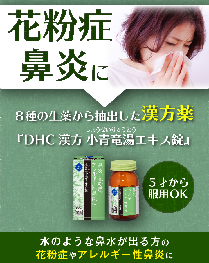 『DHC漢方 小青竜湯しょうせいりゅうとうエキス錠』は、中国の古典医学書「傷寒論しょうかんろん」「金匱要略きんきようりゃく」に収載されている小青竜湯しょうせいりゅうとうのエキスを服用しやすい錠剤にした漢方薬です。うすい水のようなたんを伴うせきや鼻水がでる方のアレルギー性鼻炎、花粉症、気管支炎などの症状を改善します。