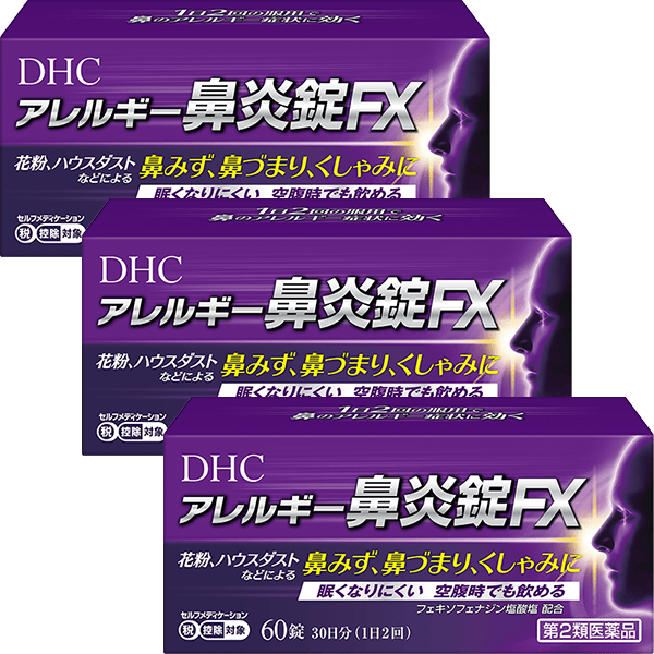 『DHCアレルギー鼻炎錠FX』は、フェキソフェナジン塩酸塩を配合した、眠くなりにくいアレルギー専用鼻炎薬です。