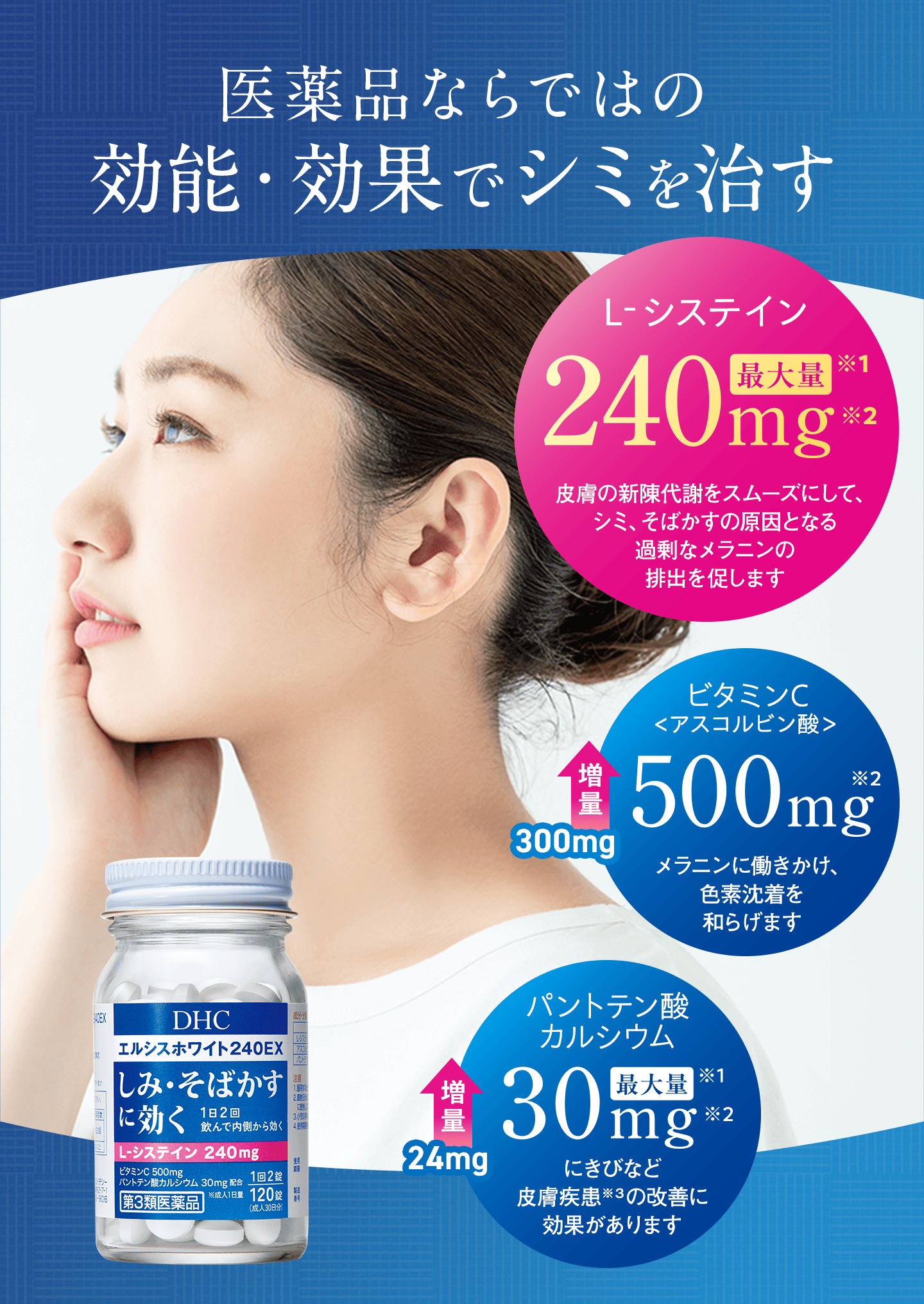 さらに、色素沈着を防ぐビタミンCと、ビタミンCのはたらきを助けるパントテン酸カルシウムが、L-システインとともに、しみ・そばかす・日やけなどの症状を改善します。