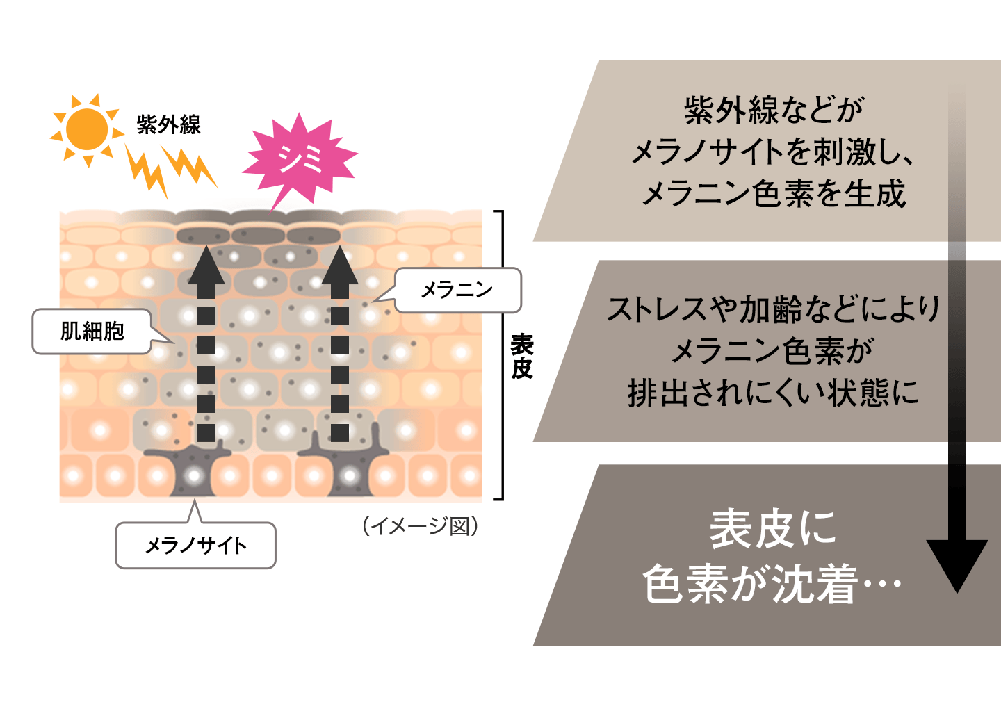 紫外線を受けると、メラノサイトでメラニン色素ができます。表皮まで押し上げられ散ったメラニン色素は、新陳代謝が活発であればターンオーバーとともに排出されますが、新陳代謝が滞ったり低下したりすると、しみとして残ってしまいます。