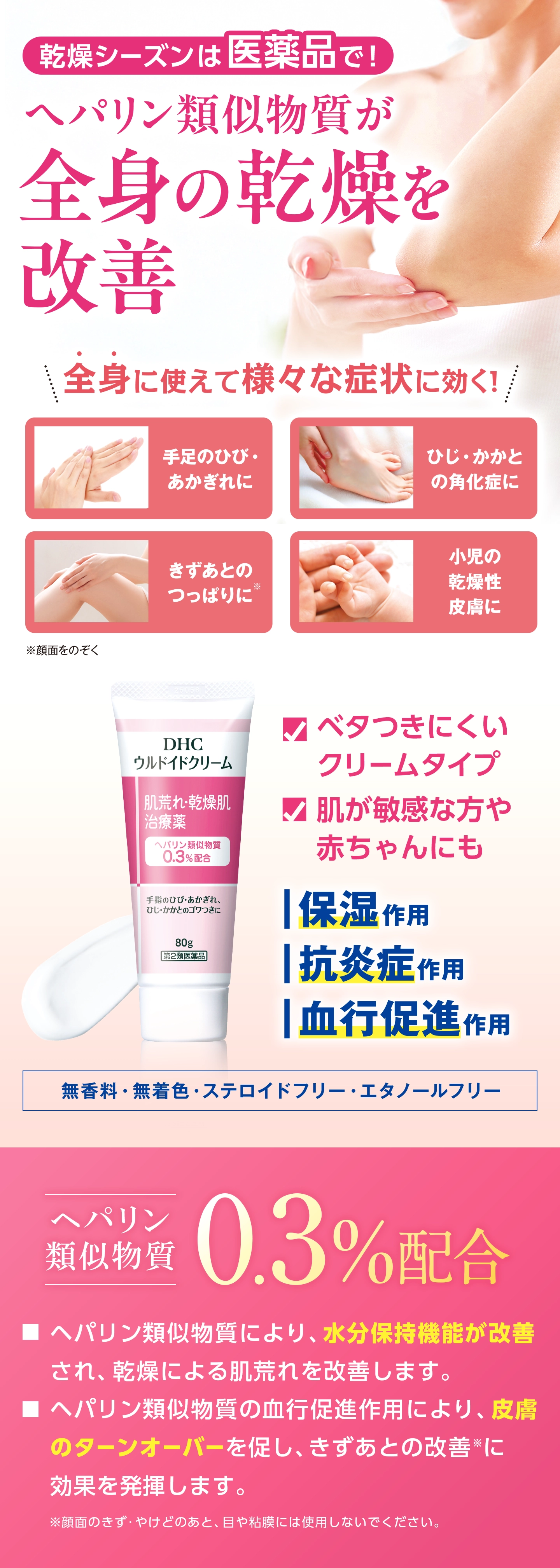 『DHCウルドイドクリーム』は、<ヘパリン類似物質>を0.3%配合した、全身に使える肌荒れ・乾燥肌治療薬です。のびがよく、ベタつきにくいクリームタイプで、肌が敏感な方や赤ちゃんにもお使いいただけます。