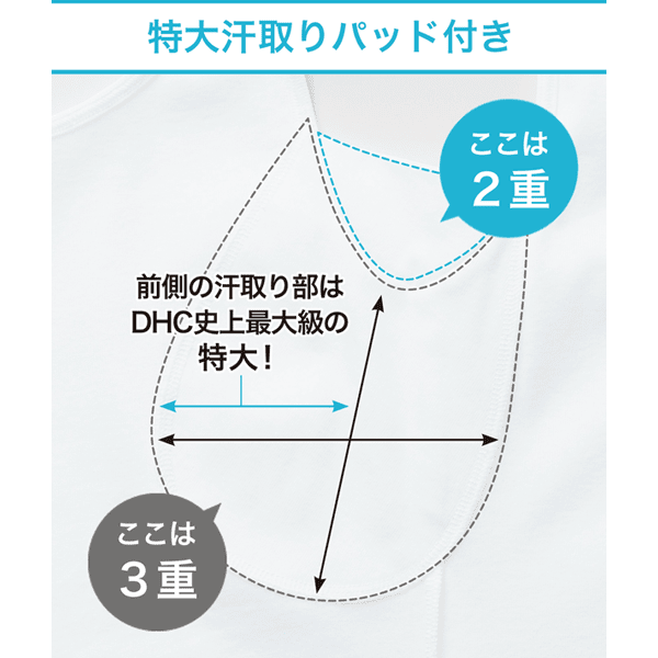 たくさん汗をかく方だと、普通の汗取りパッドじゃ心もとない…。そんな“大”汗っかきさんの声にお応えし、DHC史上最大級の面積の汗取りパッドに!普通の汗取りパッドではカバーしきれない汗もしっかり吸収。速乾性、通気性にも優れた綿100%の身生地は、サラッと心地よい着用感です。毎年汗が憂うつな方もこのインナーがあれば、快適に過ごせますよ。
