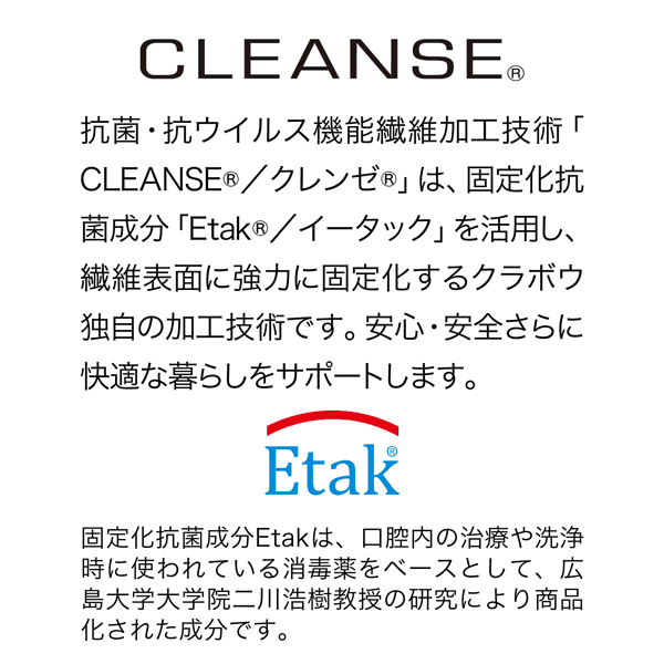 ※抗菌・抗ウイルス機能繊維加工技術「CLEANSE®/クレンゼ®」は、固定化抗菌成分「Etak®/イータック」を活用し、繊維表面に強力に固定化するクラボウ独自の加工技術です。