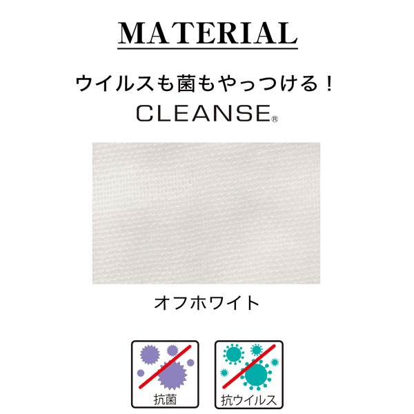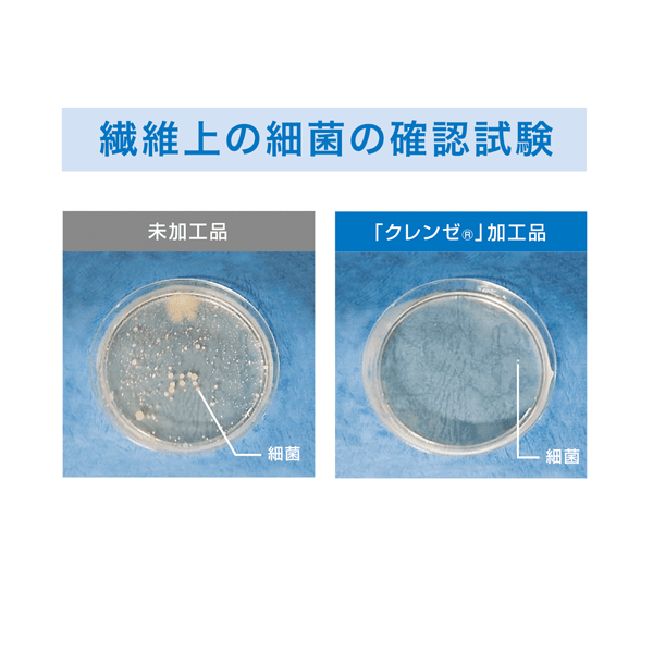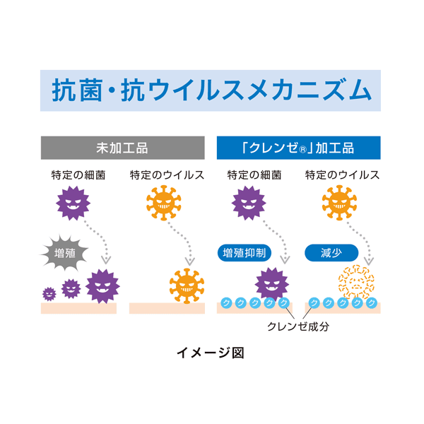 - クレンゼの効果は生地の部分のみを対象とした「繊維(生地)を清潔に保つ」機能です。抗ウイルス加工は、病気の治療や予防を目的とするものではなく、ウイルスの働きを抑制するものでもありません。