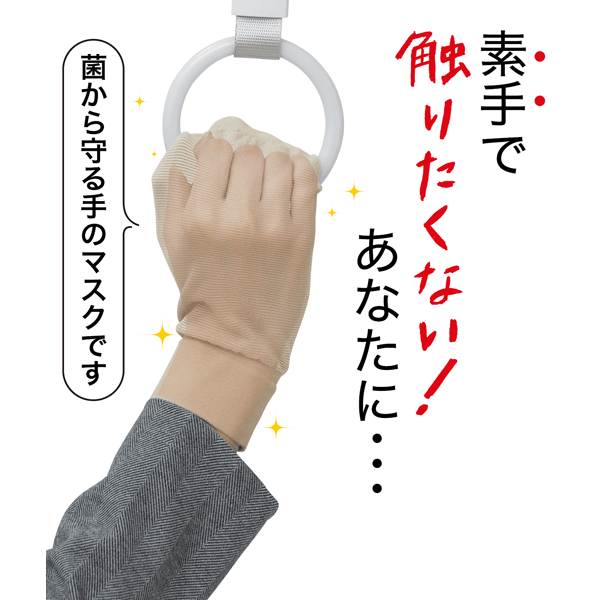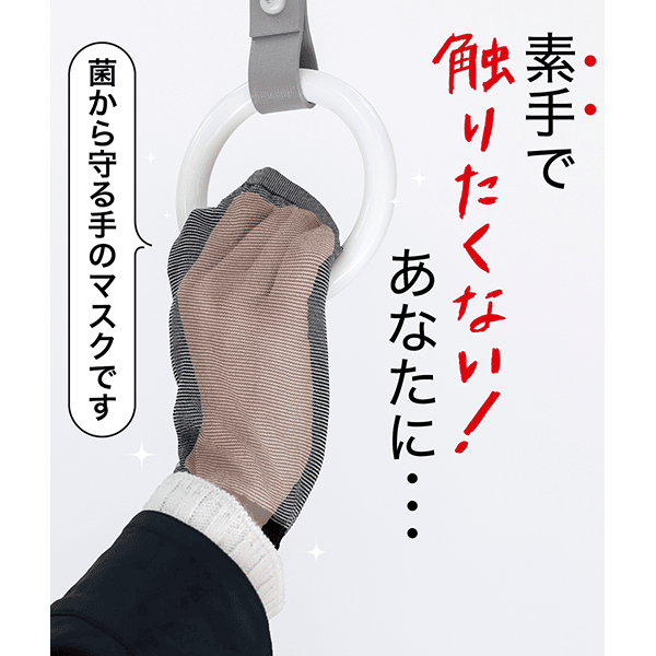 電車のつり革を持つとき、ドアノブを触るとき、お買い物をするとき・・・菌が怖くて素手で触りたくない箇所も安心!銀イオンの力で菌から手を守る手のマスクが登場しました!使わないときはくしゅくしゅさせて袖見えもできます。洗ってくり返し使用可能です。