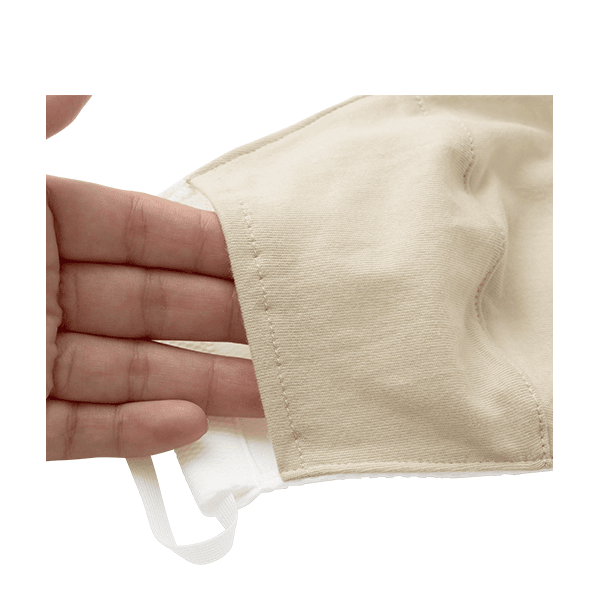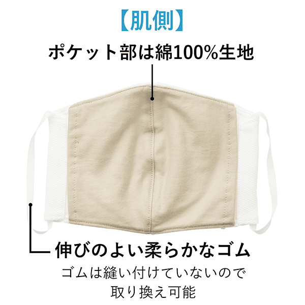 熊本産の洗えるマスクからポケット付きタイプが登場!抗菌防臭、吸水速乾機能付きでやさしい着用感です。肌側は綿100%+機能メッシュの2重構造で、表生地は吸水速乾・抗菌機能付きでUV対策もできます。ゴムは縫い付けていないので、取り換えも可能です。