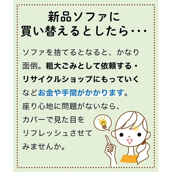 女性のちからでもラクラク♪カバーを装着するだけで新品ソファへ簡単リメイク!お手持ちのソファのリメイクや汚れ防止に最適なソファカバーです。