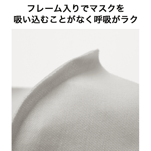 フレーム入りなのでマスクを吸い込むことがなく呼吸がラクなマスク。糸や針を使わないカットオフ仕様。のびのよい綿混素材で耳が痛くなりにくいです。抗菌防臭加工付きで清潔が保てます。