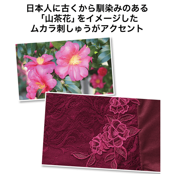 細部まで熟練した日本の技術が光る、珠玉のショーツ。資材、縫製は全て国産で統一しました。日本人に古くから馴染みのある山茶花をイメージしたムカラ刺しゅうがアクセントのラグジュアリーなデザインです。