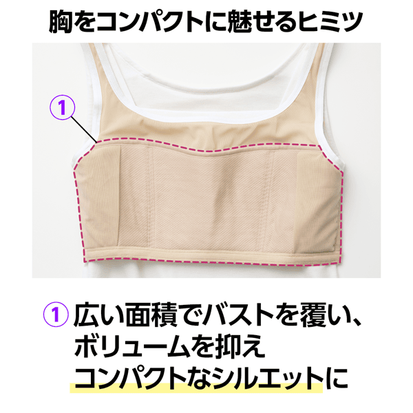 「シャツが似合わない」を解決する大人気商品、バストをコンパクトに見せるブラが使いやすいブラトップになって登場!広めの1枚型のカップでバスト全体を押さえボリュームダウン、インナーブラ部は後ろまでぐるっと1周しているので安定感があります。このブラトップでシャツスタイルがすっきりかっこよく決まります。