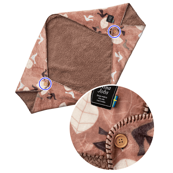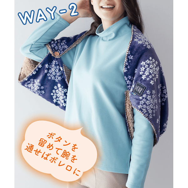ほっこりかわいい北欧柄の3WAYブランケットです。ボタンが2か所付いているので羽織りやボレロとしても使えます。