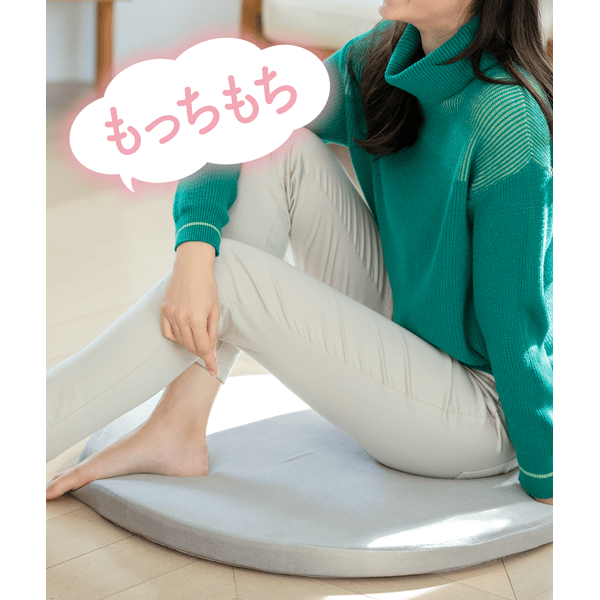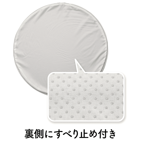 側地にはキトイオン加工を施したリビング用サークルクッションです。寝転んだりソファーのようにくつろげる大判サイズ。すべりにくいからフローリングの床でも快適です。
