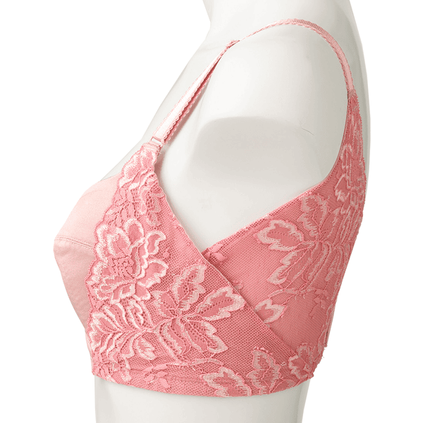 - やや光沢のある生地に2色を組み合わせたきれいなレースで高級感のある印象です。着用感は全体的にしっかりとしたホールド感を感じます。最近は楽チンなブラばかり着けていたので初めは「苦しいかも・・」と心配でしたが、逆に”スッ”と背筋が伸びてなんだか姿勢まで良くなる気がしました。バストトップの位置は確かに上がります!アウターを着るとそのシルエットの差は歴然で、「これで5歳若返ったのか」となんだか嬉しくなりました。脇もすっきり見えるので、なんだか体重も3キロくらい痩せて見えます。