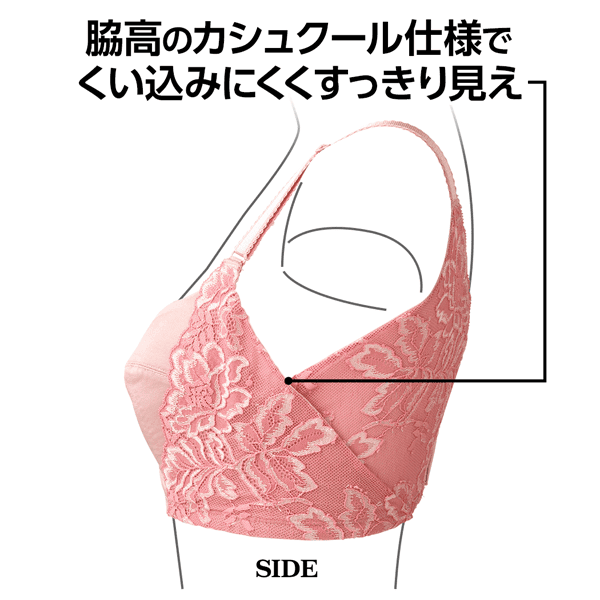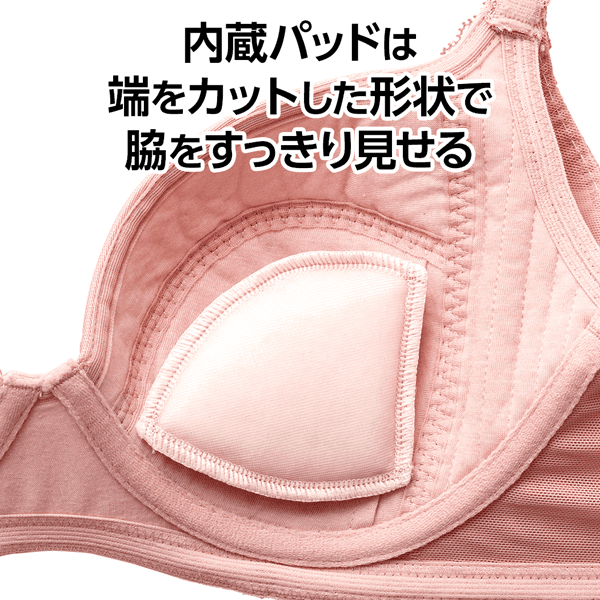 - 普段着用しているブラと比べるとバストトップの位置が上がっているのが分かりました。サイドパネルや内蔵パッドの形状もあって、バスト横の膨らみも中心に寄せながらすっきり見せてくれます。脇高のカシュクール仕様で、気になる脇肉や背中の段差もしっかり押さえてくれます。