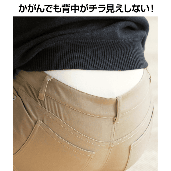 - ほどよい微起毛素材で着た時の”ひやっと感”がなく、ぬくもりを感じます。柔らかく伸びの良い素材なので着ている間中快適です。後ろ側はお尻にかかるほどの長めの丈なので、冷えが気になる季節も安心です。