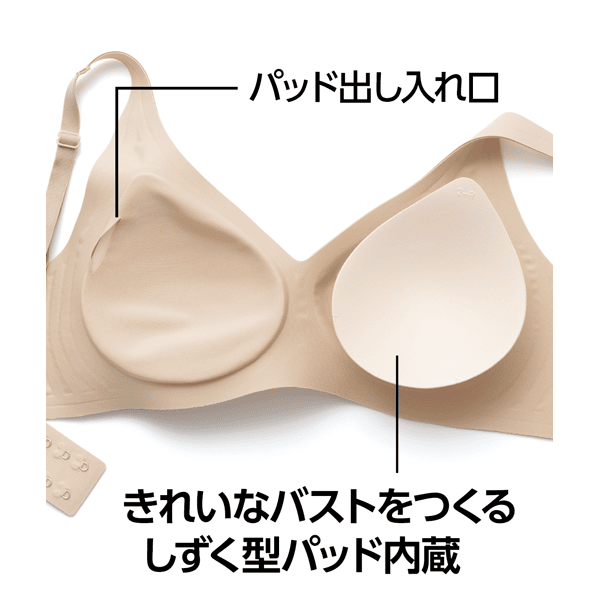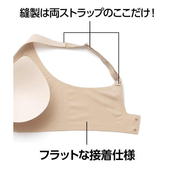 「肌あたりのよさ」と「安定感」を両立した、新感覚ブラが満を持して登場です!縫製を極力なくした接着仕様とプリントネームで肌あたりのよさを実現。接着仕様にはソフトなサポート力があり、ノンワイヤーなのに安定感があります。とろけるような肌ざわりのストレッチ素材でしなやかにフィットする感覚はまるで素肌でいるよう。それでいて、ホックとストラップで調節可能…。まさに、ほかでは体験できない調節できるストレスフリーブラです!
