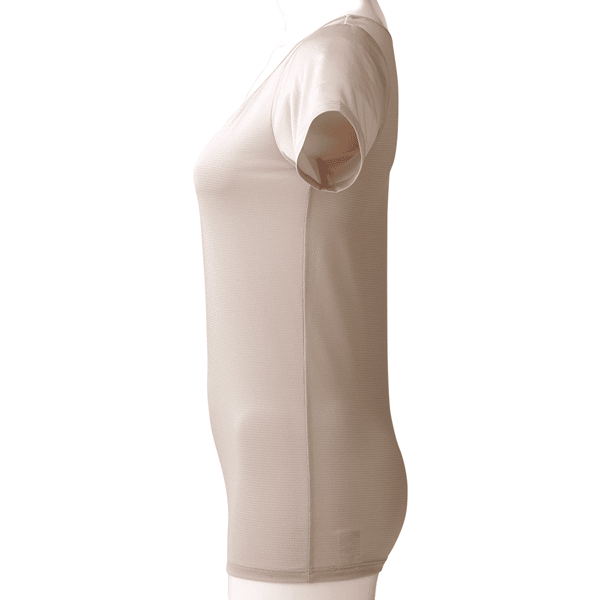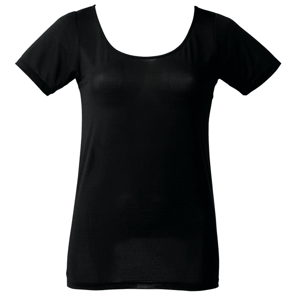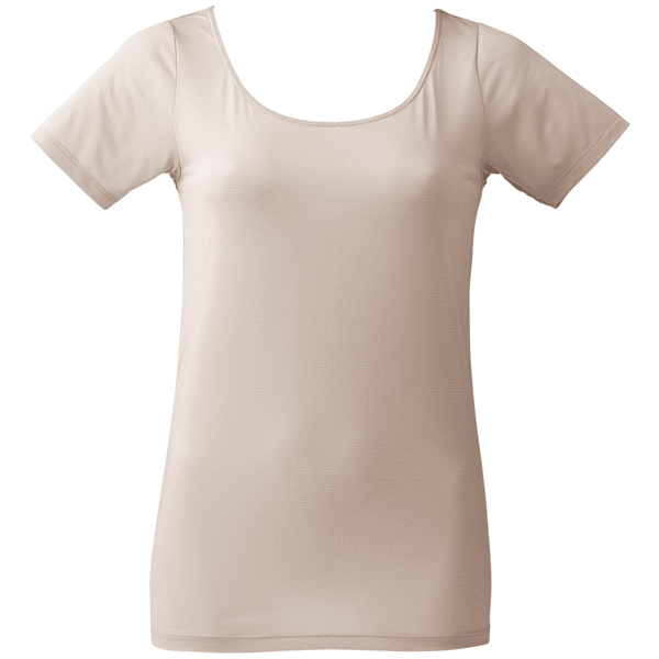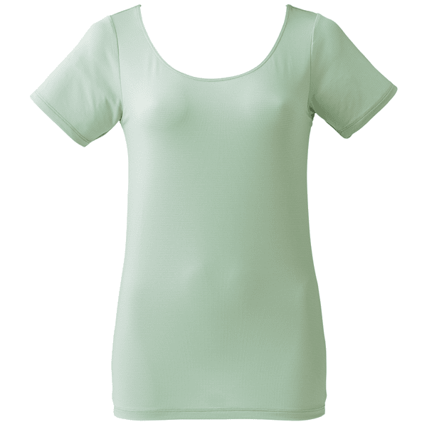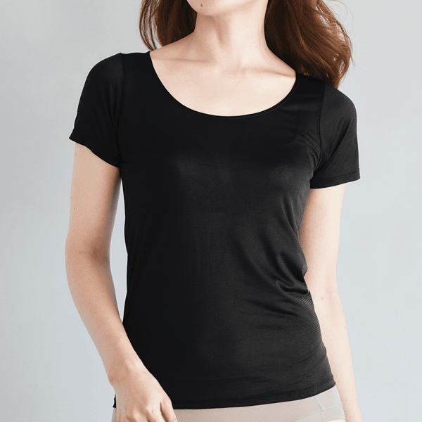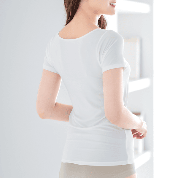- 伸縮性があり、やわらかくて気持ちいい素材です。ぶ厚くないのでアウターに響かず、すっきりと着用できました。デザインはシンプルでかがんでも背中が出ないくらいの身丈で安心ですし、ほど良い衿ぐりの広さで、半袖なので脇からもブラがはみ出にくく使用しやすいです。吸水速乾・吸放湿・接触冷感・抗菌防臭と多機能でシワにもなりにくいので、数枚購入して毎日使用したいと思いました。