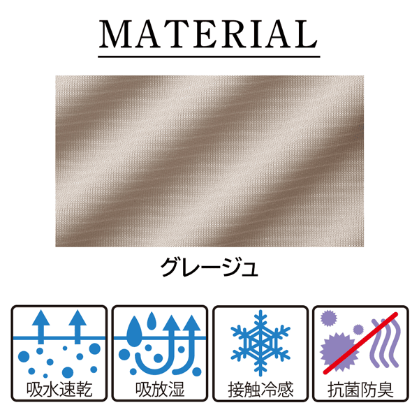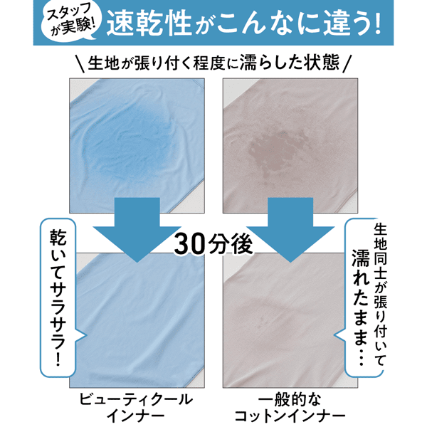 「ビューティクール」の快適のヒミツは、その素材。主原料のポリエステルは繊維の中に水分が入り込まず、水や汗が生地に触れたときに拡散して蒸発する速乾性を持っています。そこにキュプラを加えることで、身体から出る湿気(ムレ)を吸って放湿する機能を足しました。これらの速乾性と吸放湿性により、いつでもサラサラ。サラッとしていながら、なめらかで肌に吸い付くような素材で着心地は快適。そのほか、接触冷感や抗菌防臭など、夏にうれしい機能を盛り込みました。おすすめポイント