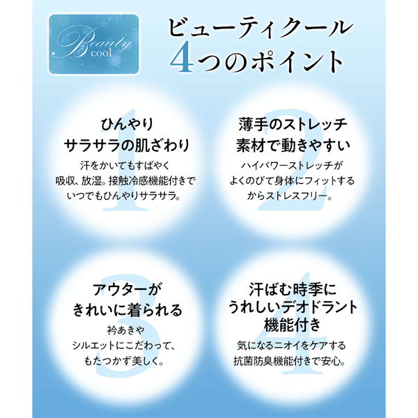 「ビューティクール」の快適のヒミツは、その素材。主原料のポリエステルは繊維の中に水分が入り込まず、水や汗が生地に触れたときに拡散して蒸発する速乾性を持っています。そこにキュプラを加えることで、身体から出る湿気(ムレ)を吸って放湿する機能を足しました。これらの速乾性と吸放湿性により、いつでもサラサラ。サラッとしていながら、なめらかで肌に吸い付くような素材で着心地は快適。そのほか、接触冷感や抗菌防臭など、夏にうれしい機能を盛り込みました。おすすめポイント