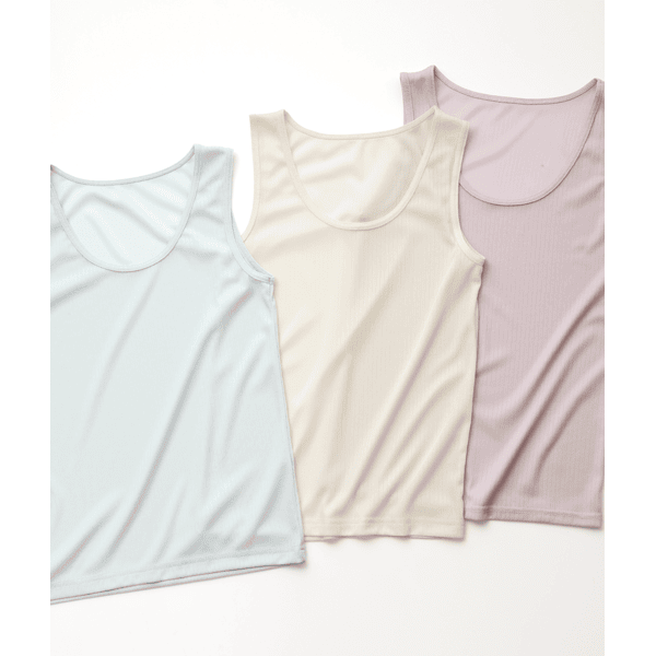 洗い替えにも便利なさらっとタンクトップ3枚組。サックス系はサックス・クリーム・ラベンダーの3色セット、使いやすいブラックは同色3枚セットです。吸水速乾機能付きで、いつも涼しく快適に着られます。